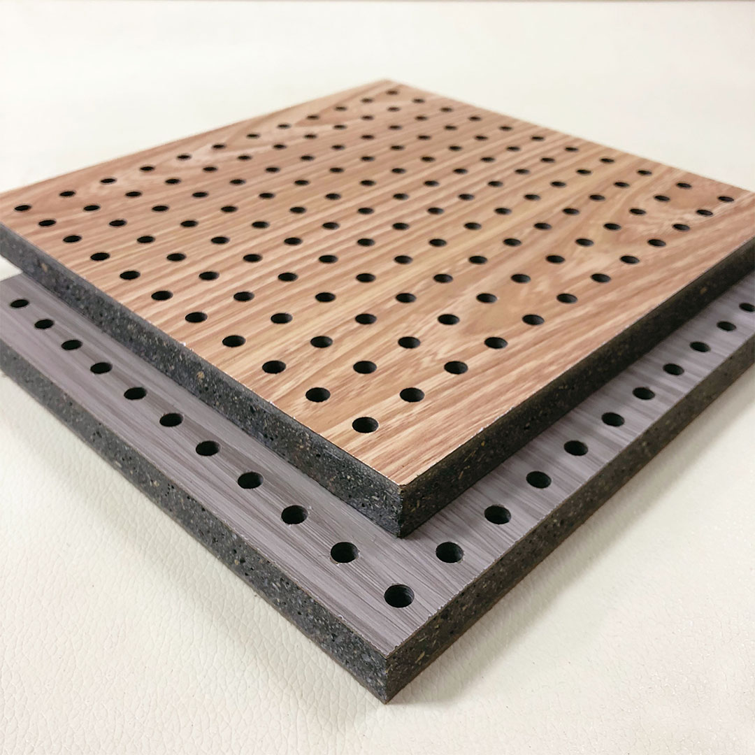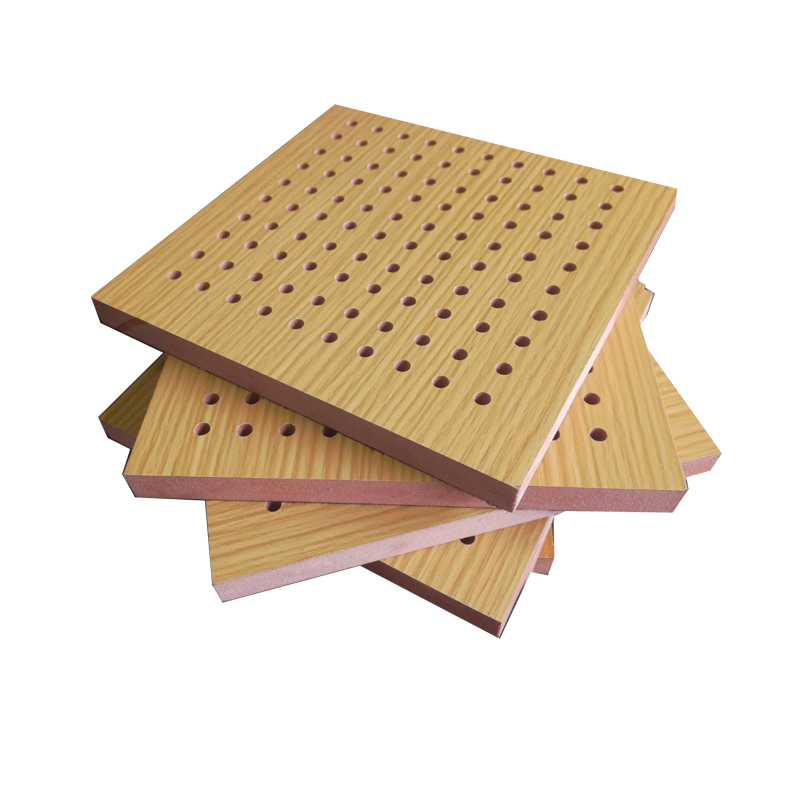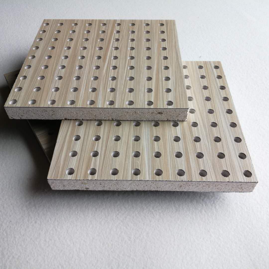 孔木吸音板是一種在密(mì)度板等板材的正麵,背麵都開圓孔的結構吸聲材料;孔木吸(xī)音板對吸聲頻譜(pǔ)選(xuǎn)擇性較(jiào)強,對低頻有很好的吸聲性能(néng)。吸聲結構後空腔上(shàng)填入適量(liàng)的吸聲棉可提高中(zhōng)、低頻吸聲效果(guǒ)。