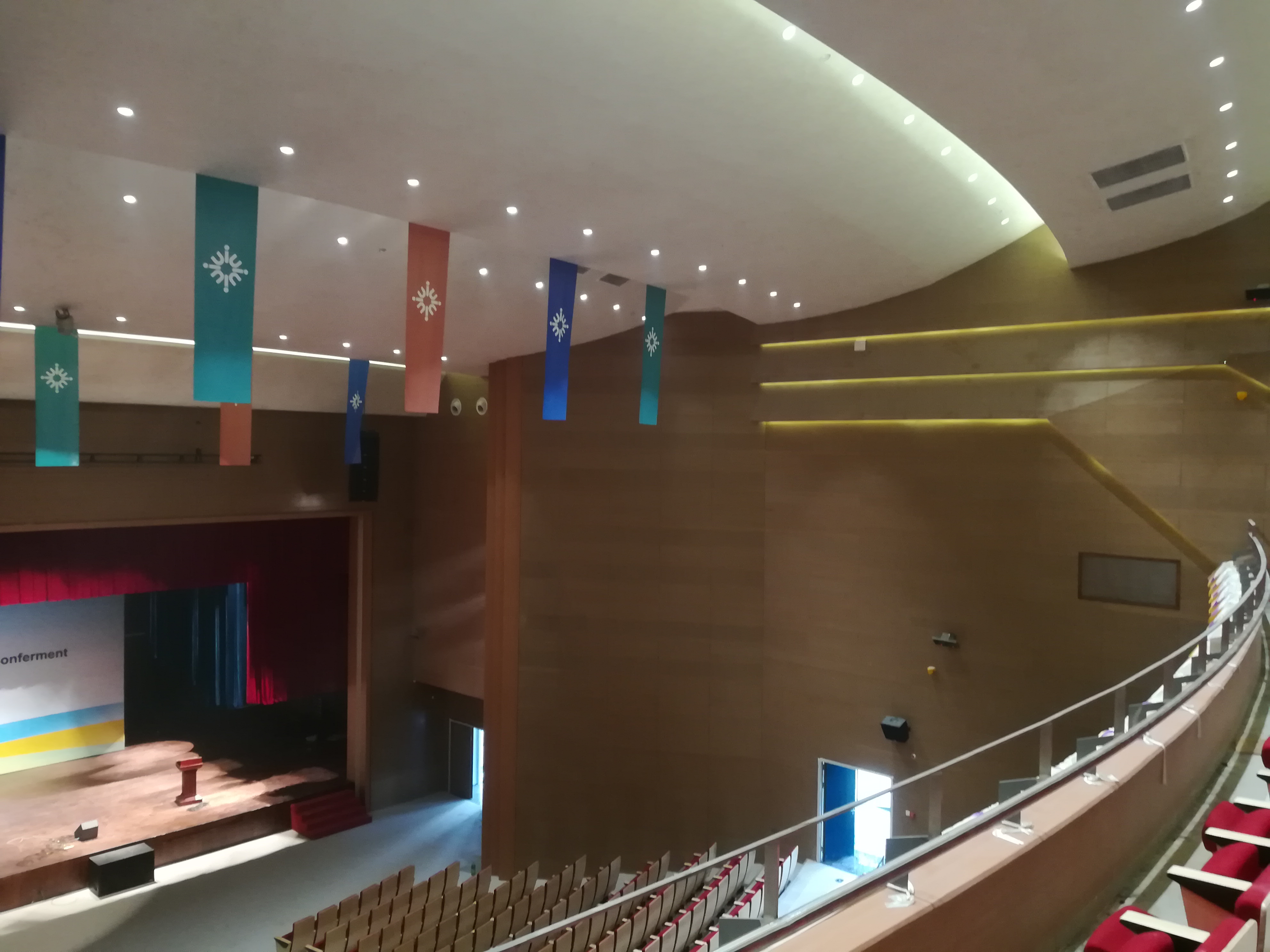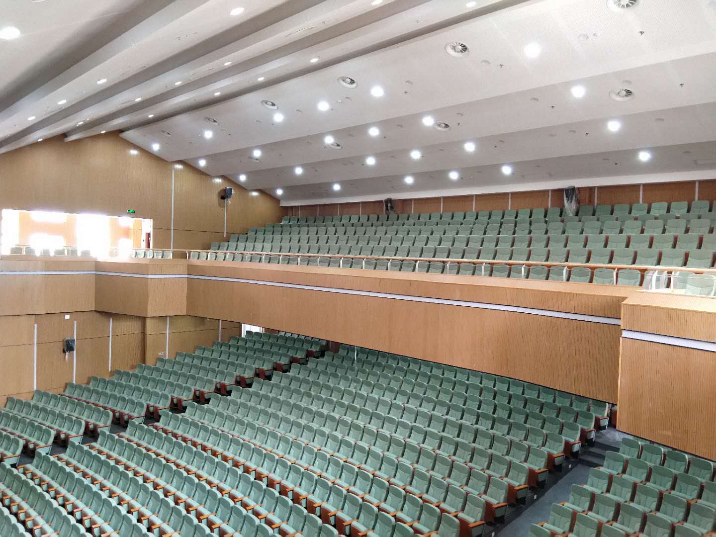 珠海UIC學(xué)校多(duō)功能禮堂:牆麵大麵積安裝木質衝孔吸音板,規格尺寸統一,安裝便捷(jié)。